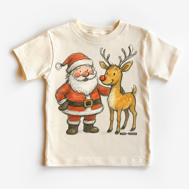 Santa and Reindeer Christmas T-Shirt - Retro Sketch Art Tee